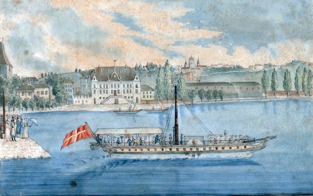It was built at the initiative of the United States consul in France, Edward Church (Boston 1775 – 1838), a businessman and diplomat passionate about the invention of his compatriot and friend Robert Fulton: the first promoter of navigation by steamboat on the Hudson (1807). Arriving in Geneva in December 1822, Edward Church noted that on Lake Geneva no steamboats circulated, he was surprised to see this “free, enlightened, ingenious nation, placed in the center of Europe, remain until now private of this benefit of sciences and arts”, while according to him more than five hundred steamboats already exist in the world. With the agreement of the Vaud and Geneva governments to operate a line, he built the first steamboat on Lake Geneva, the “Guillaume Tell”, put into service between Geneva and Ouchy on May 28, 1823.